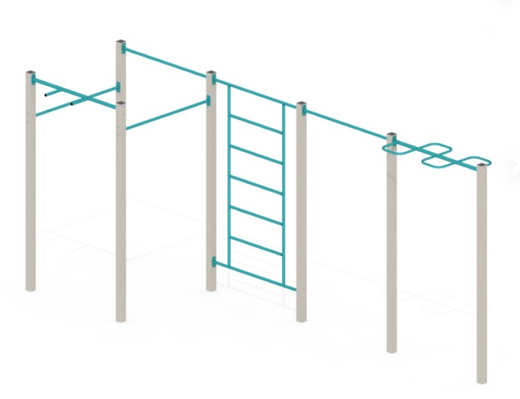 Складається з: Рукохід 2 шт., Майданчик без даху 3 шт., Гірка 1 шт., Місток 1 шт., Турнік 2 шт., Шведська стінка 4 шт., Місток на ланцюгах 1 шт., Дошка альпініста 1 шт., Баскетбольне кільце 1 шт.