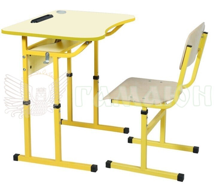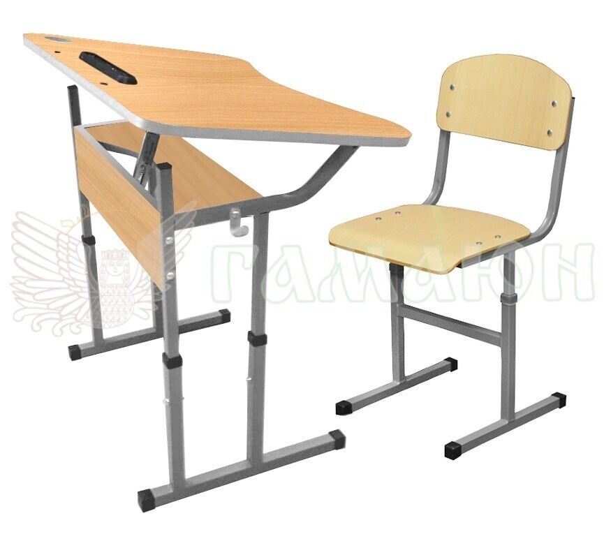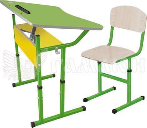 Комплект, cтіл учнівський 1-місний з регулюванням кута нахилу стільниці та полицею, ростова група №3-6 + cтілець Т-подібний на квадратній трубі, регулюється на ростові групи №3-6